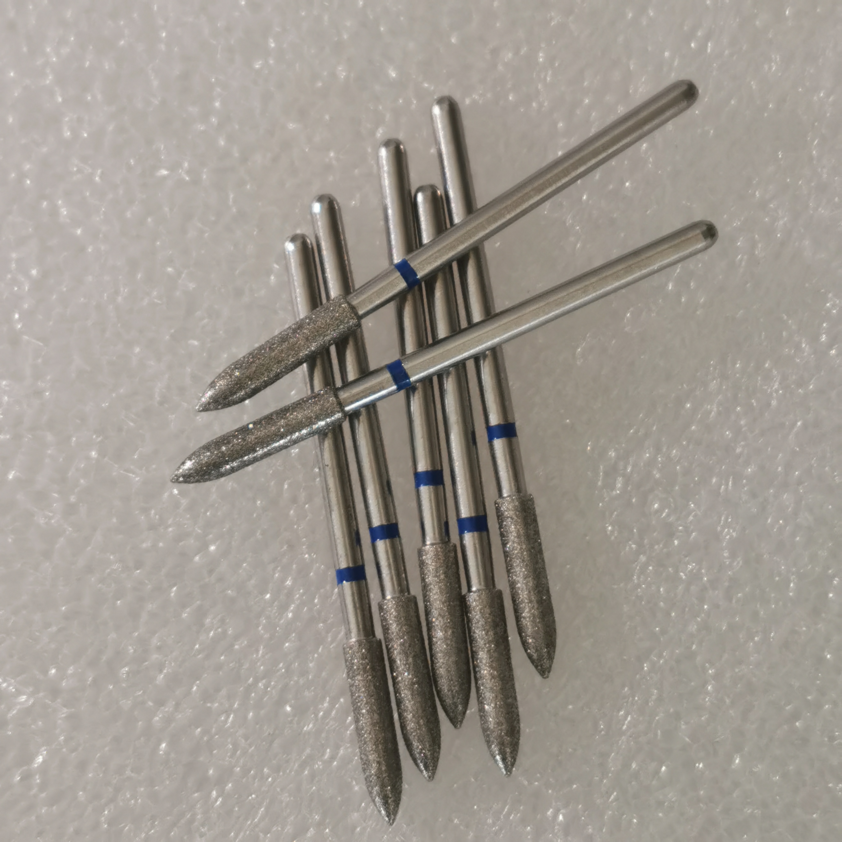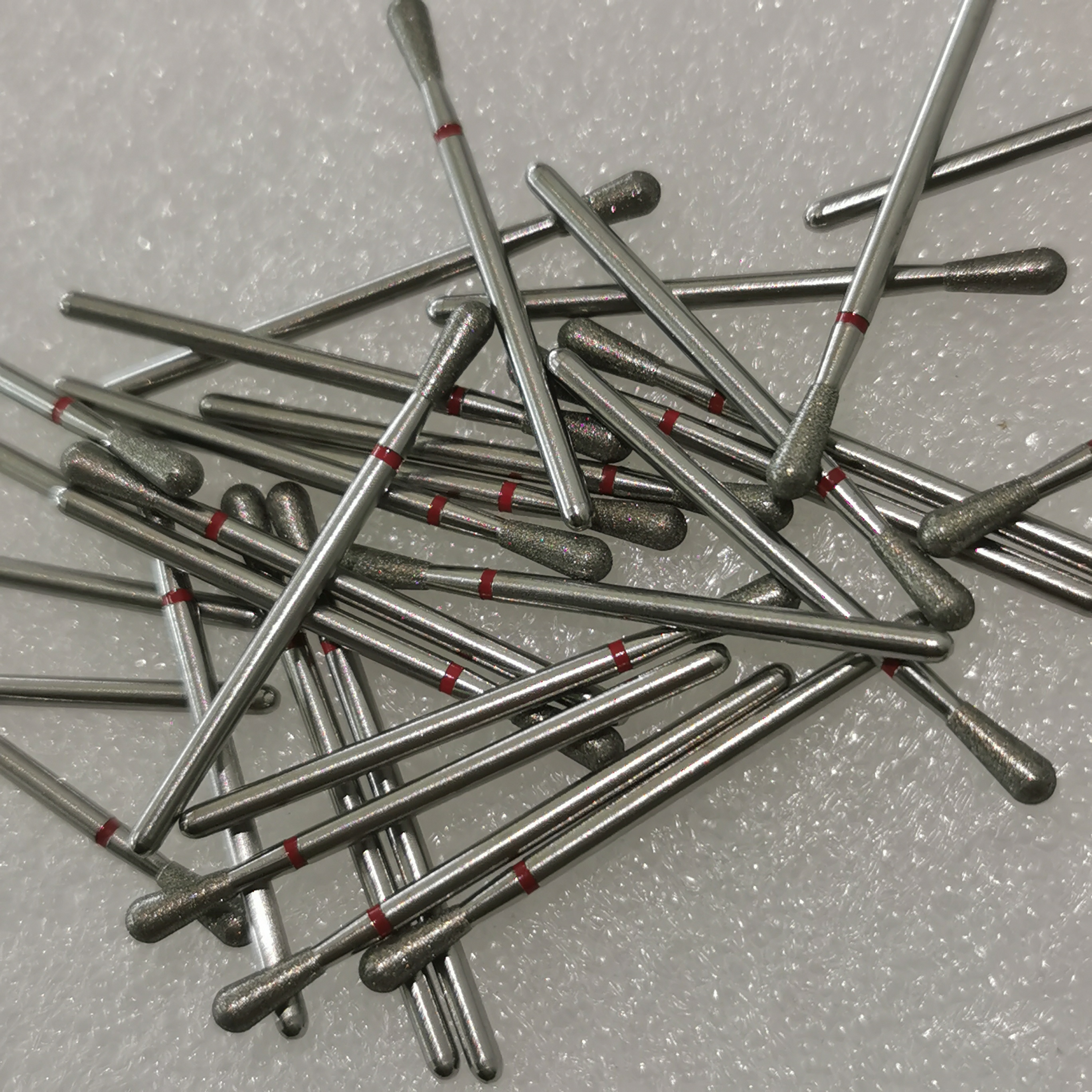 Basis bur berlian biasanya terbuat dari baja tahan karat. Ini melayani fungsi pendukung dan pemasangan, dan bentuknya disesuaikan dengan kebutuhan, umumnya termasuk bentuk silinder, kerucut, bola, dan melengkung. Lapisan pengikatnya sebagian besar adalah paduan nikel atau nikel-kobalt. Itu ditanam dengan elektrodeposisi, menanamkan dan memperbaiki partikel berlian secara mekanis. Lapisan abrasif terdiri dari partikel berlian. Ukuran partikel, konsentrasi, dan kadar yang berbeda dipilih sesuai dengan kebutuhan pemrosesan.